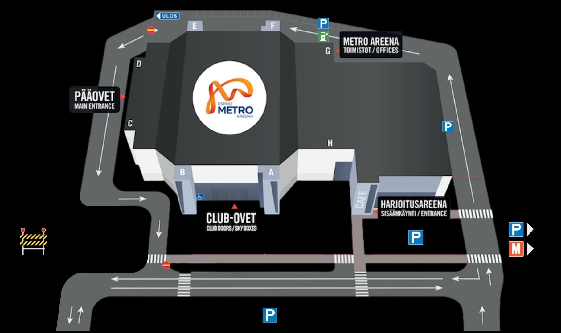 Espoo Metro Areena sijaitsee Tapiolan Urheilupuistossa, Espoossa, hyvien liikenneyhteyksien varrella. Areena on helposti saavutettavissa niin julkisilla kulkuvälineillä kuin kevyen liikenteen väyliä pitkin. Kannustamme saapumaan Areenalle kestäviä liikkumistapoja hyödyntäen.