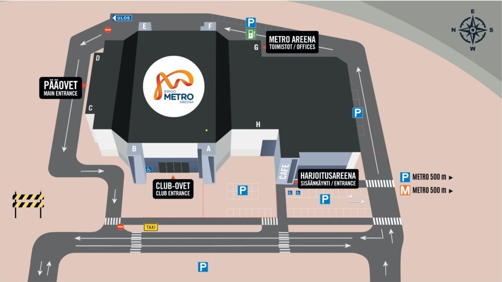 Espoo Metro Areenan läheisyydessä, Tapiolan urheilupuiston alueella, on rajallinen määrä maksutonta ja maksullista pysäköintitilaa, joten suosittelemme vahvasti saapumista julkisilla. Pysäköintiä Espoo Metro Areenan ja Tapiolan Harjoitusareenan vieraspaikoille hallinnoidaan EasyPark -sovelluksella.
